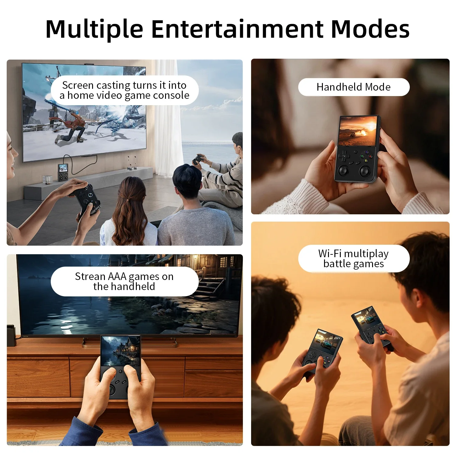 RG35XX Pro es un dispositivo de entretenimiento multifunción.Puedes escuchar la música, ver la televisión.Soportes 2.Conexión de controlador inalámbrico 4G y controlador por cable, conexión de controlador Bluetooth, conexión HD al televisor, multijugador en línea a través de WiFi y transmisión para una mejor experiencia de juego, la consola de juegos es simple y fácil de usar, y también es muy amigable para los principiantes.
