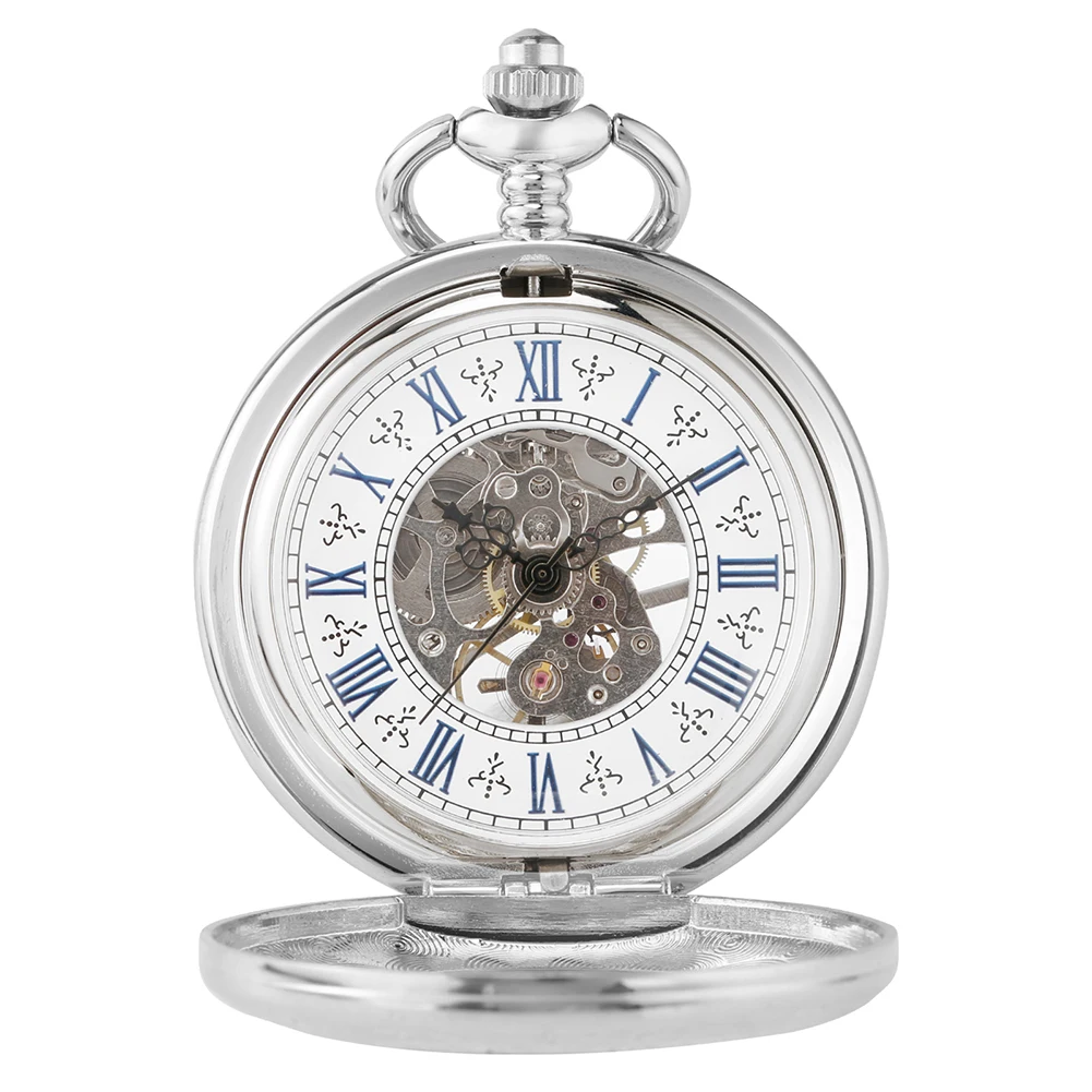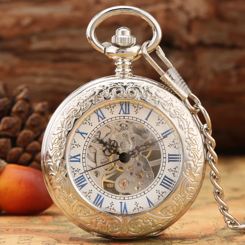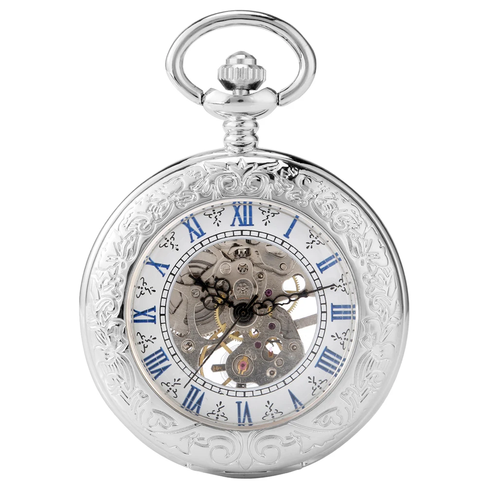 Reloj de bolsillo antiguo de cuerda a mano mecánico de plata exquisito números romanos azules pantalla colgante de esqueleto reloj regalos para personas mayores